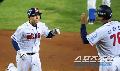 두산과 삼성의 2011 프로야구 경기가 27일 잠실 야구장에서 펼쳐 졌다. 두산 손시헌이 2회말 선제 투런 홈런을 치고 장원진 코치와 하이파이브를 하고 있다.잠실=조병관 기자 rainmaker@sportschosun.com/2011.09.27/